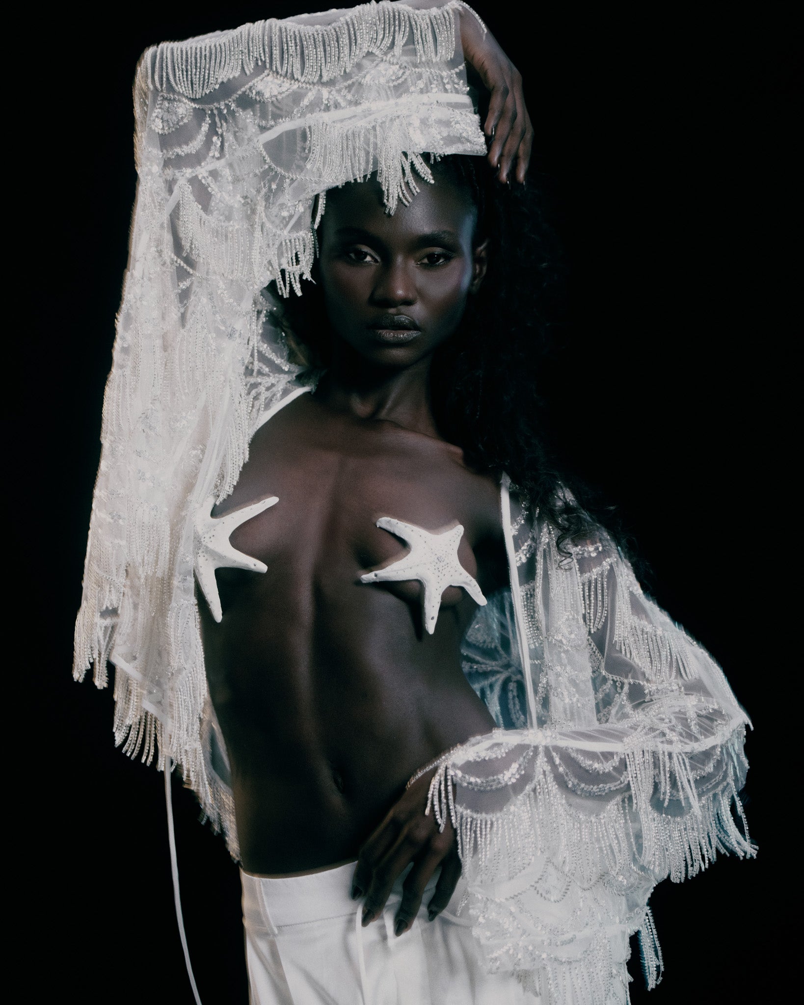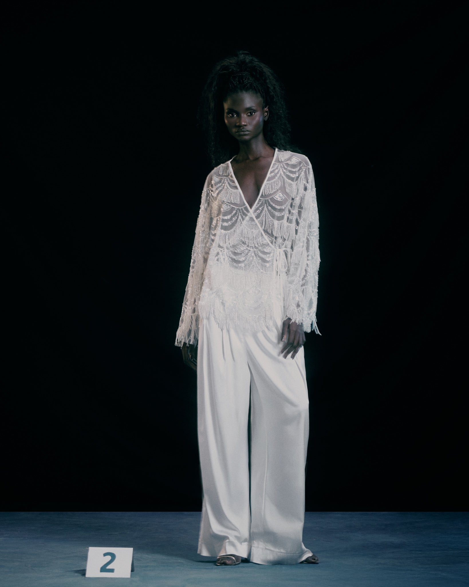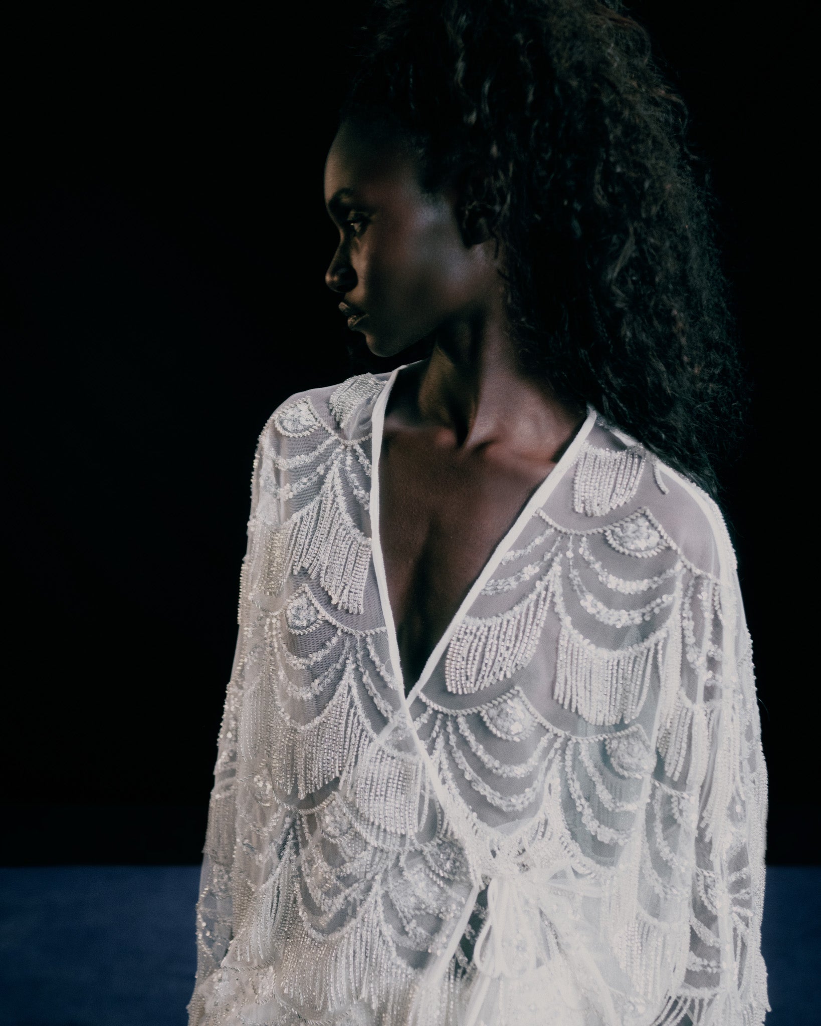 Kimono transpassado todo bordado em miçanga e com franjas.
