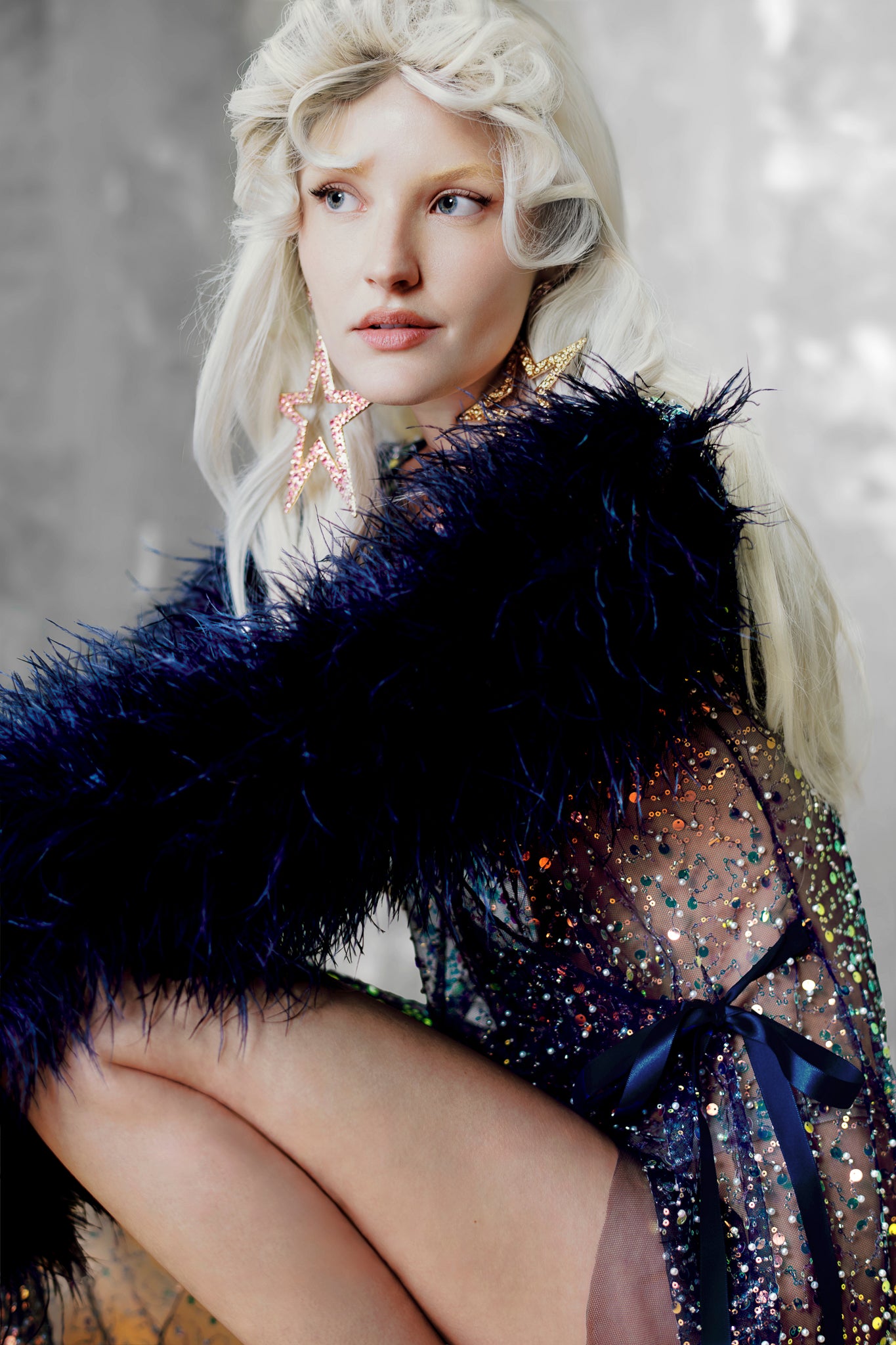 Vestido de tule bordado com mangas sino e aplicação de plumas de avestruz.